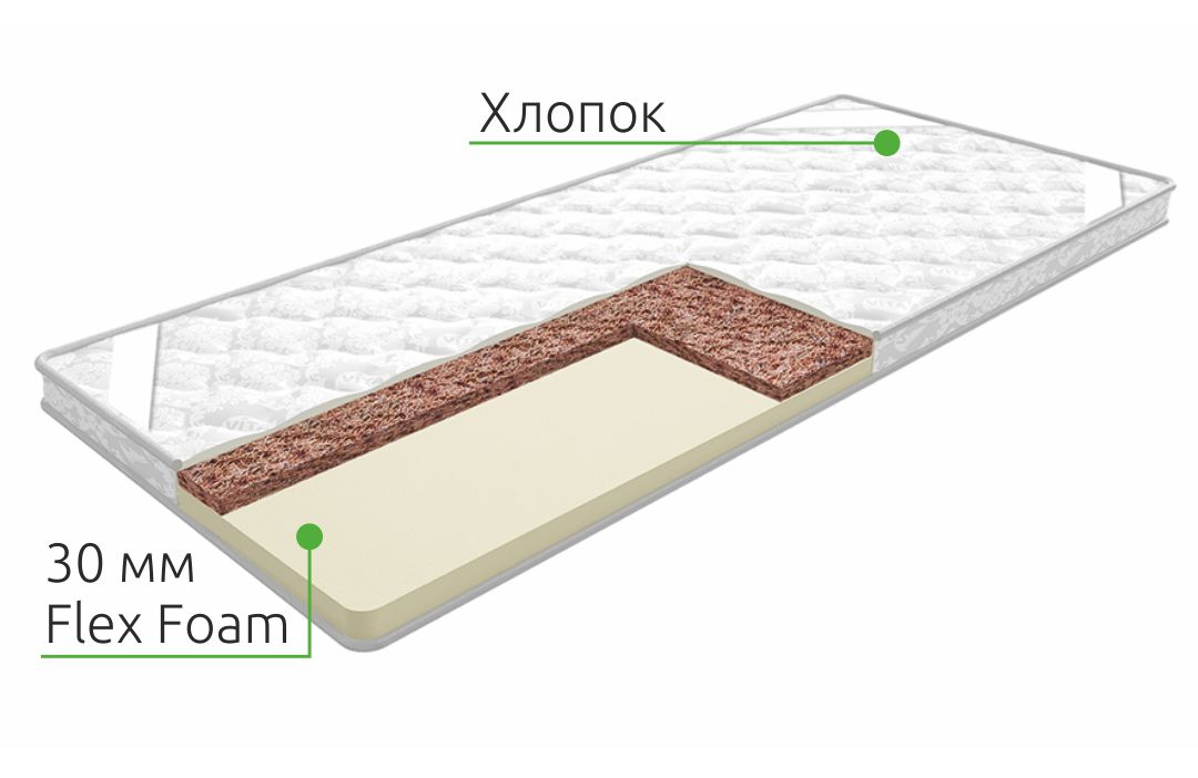 Тонкий наматрасник из двух плит натуральной латексированной кокосовой койры 2 см и искусственной высокоэластичной пены Flex Foam 3 см высотой. В зависимости от стороны использования этот разносторонний топпер либо повышает жёсткость Вашего матраса, либо понижает. Рекомендуем использовать только на ровных поверхностях!