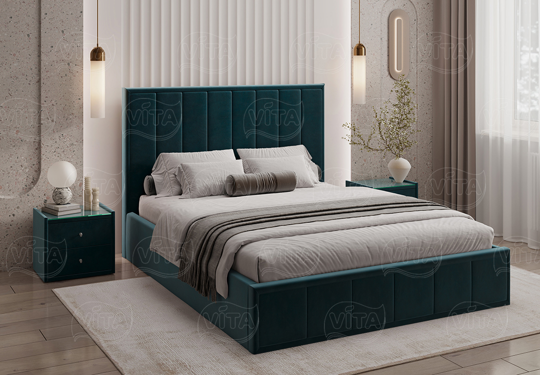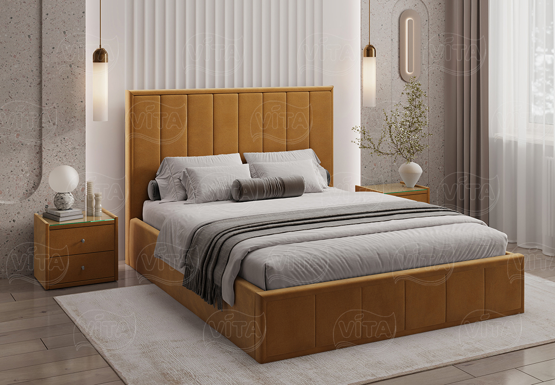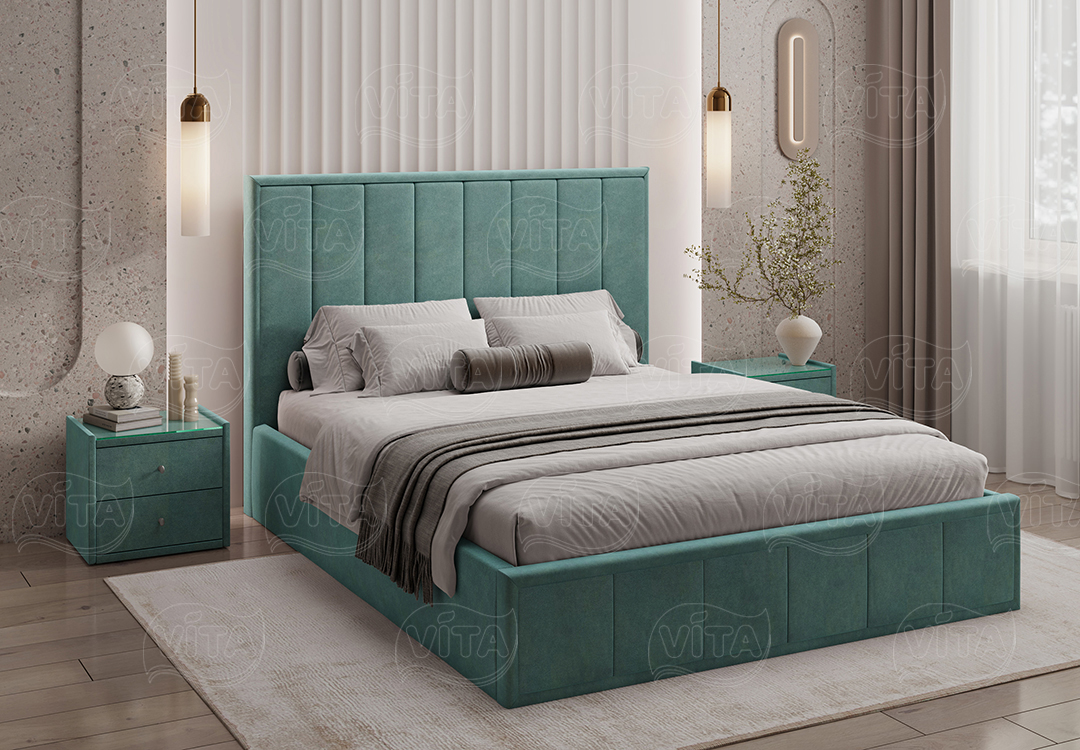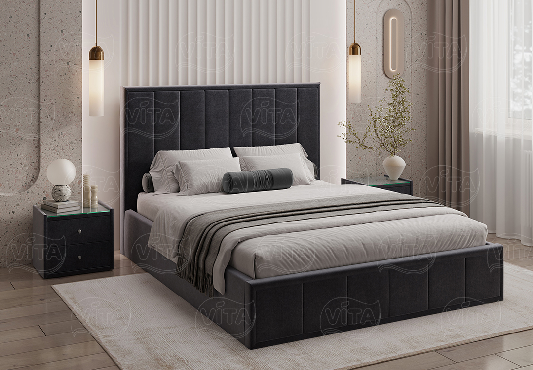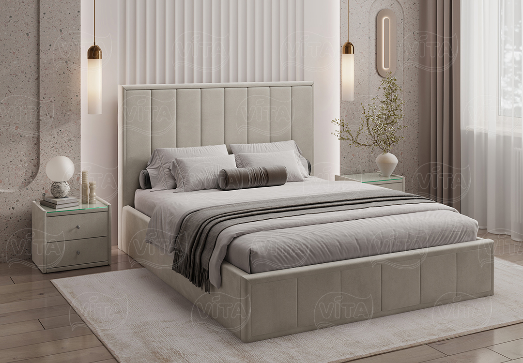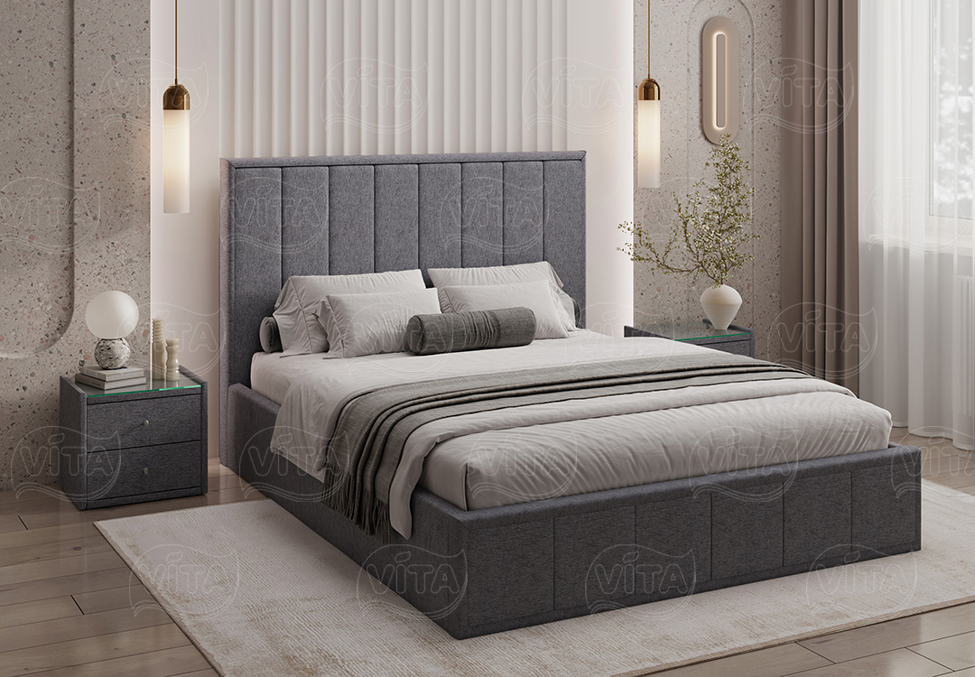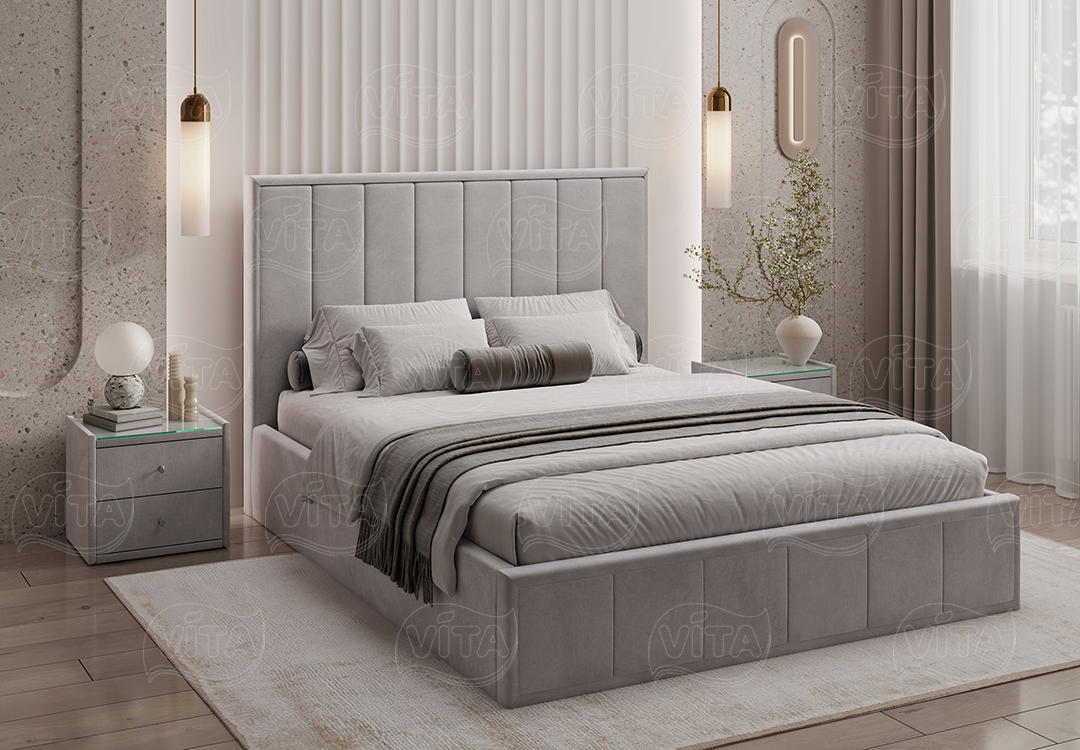 Кровать Грация с ортопедическим основанием и механизмом подъема. Бельевой ящик с надежным дном. Обивка из износостойкой ткани различных цветов и фактур.