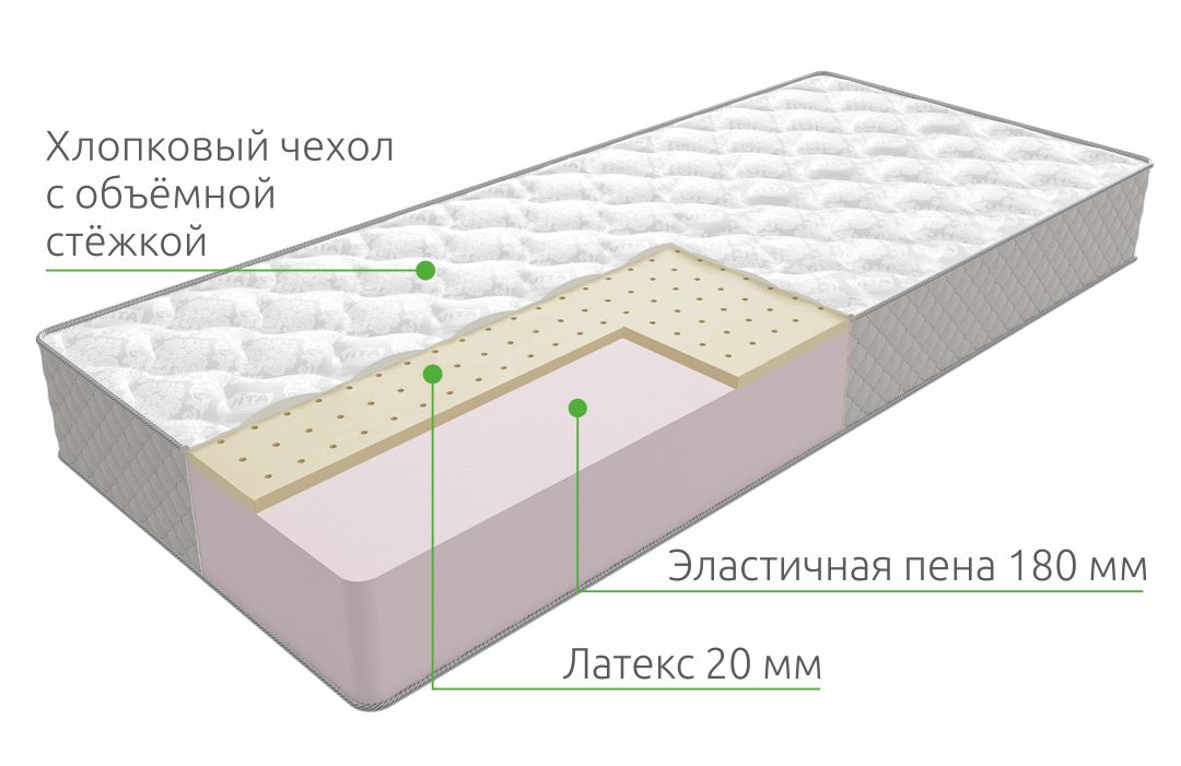 Мягкий беспружинный матрас Big Latex создан из монолитной 18-сантиметровой плиты высокоэластичной пены и 20 мм натурального перфорированного латекса. Благодаря такому составу он имеет высокую степень анатомичности. На 1 спальное место модели при общей высоте 21 см рекомендуется нагрузка до 130 кг.